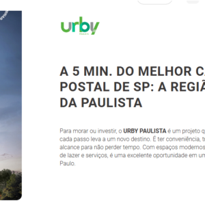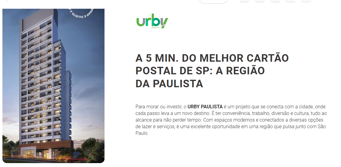 A 5 min. do melhor cartão postal de SP: A região da Paulista Para morar ou investir, o URBY PAULISTA é um projeto que se conecta com a cidade, onde cada passo leva a um novo destino. É ter conveniência, trabalho, diversão e cultura, tudo ao alcance para não perder tempo. Com espaços modernos e conectados a diversas opções de lazer e serviços, é uma excelente oportunidade em uma região que pulsa junto com São Paulo.